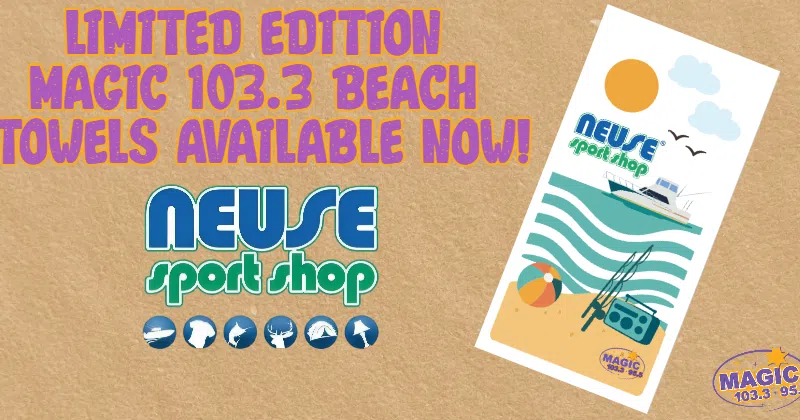 It’s not just a Magic 103.3 And 95.5 beach towel – it’s a souvenir of sun-soaked fun and water-filled memories! Available now at Neuse Sport Shop, 1021 Cedar...